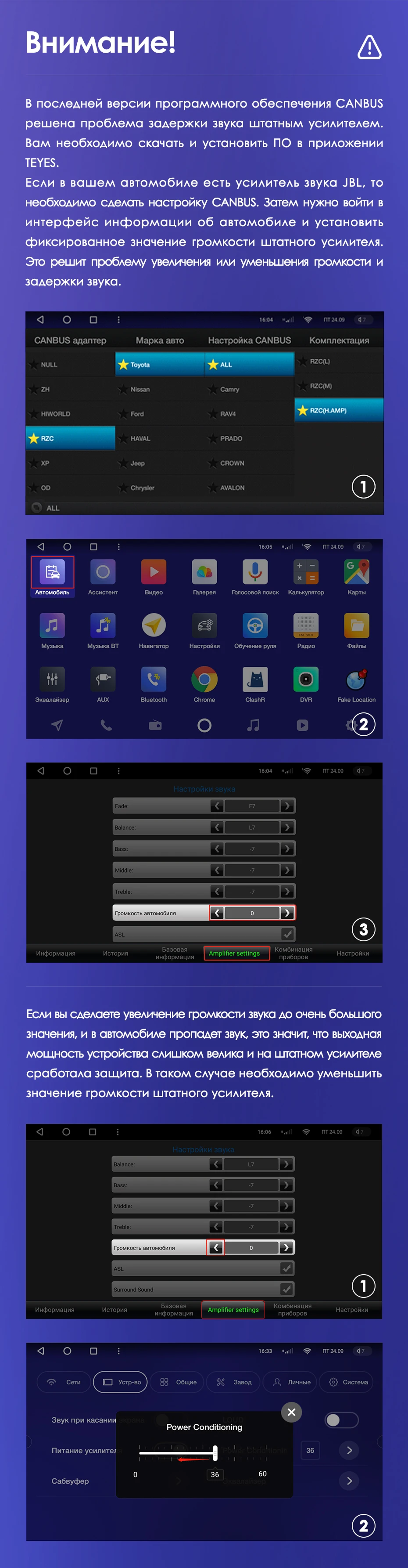 Главным достоянием Teyes CC3 является объёмный звук. Вы можете создать такую акустическую среду в салоне автомобиля, которую пожелаете - без задержек и помех. Это возможно благодаря двойному звуковому чипу DPS Adau1701 + Rohm32107 и коаксиальному (оптоволоконным) кабелю цифрового аудиовыхода, который снижает уровень фоновых шумов.