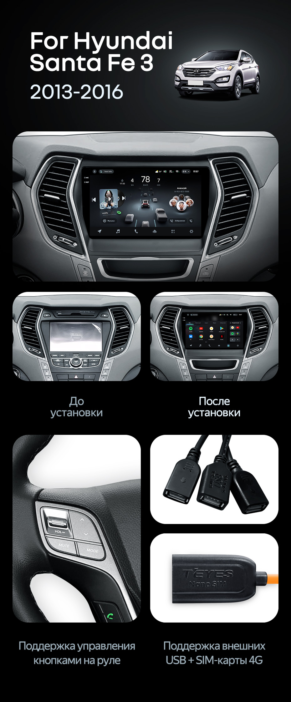 Штатная магнитола Teyes CC4 Pro 8/128 Hyundai Santa Fe 3 (2013-2016) Тип-A - купить всего за 63 770 руб. в интернет-магазине в Уфе Teyes.com.ru. ✓ Самый лучший выбор мультимедиа ✓ Лучшая замена штатному ГУ ✓ Тел. +7 (800) 775-31-74