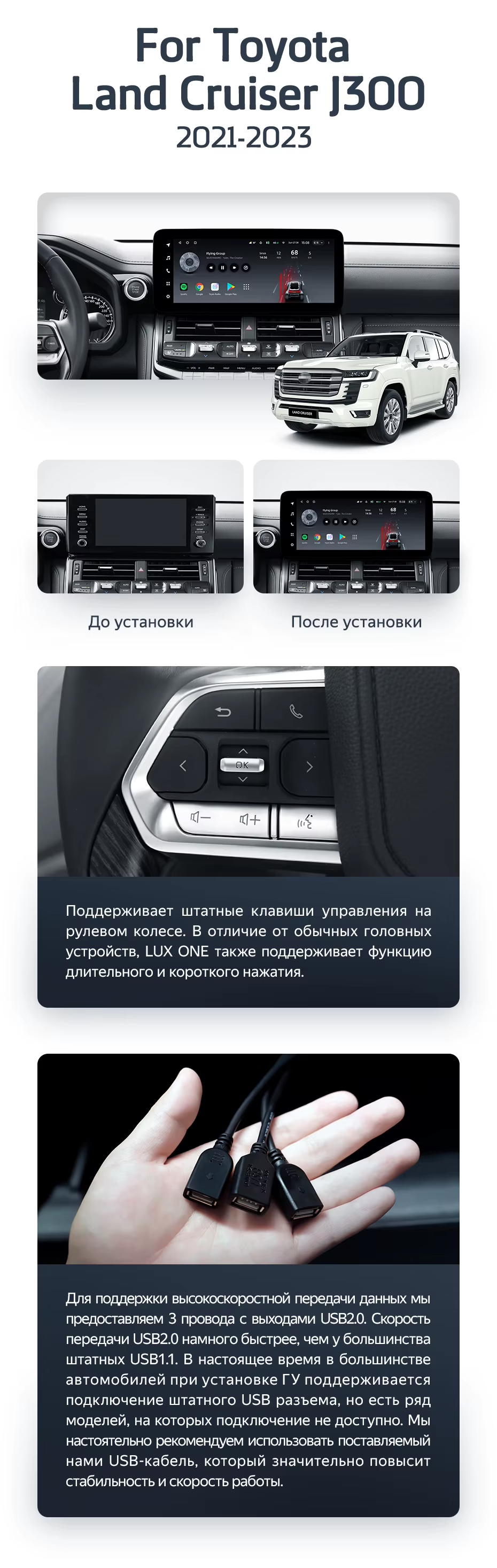 Установочный комплект для Toyota Land Cruiser 300 (2021-2023) включает переходную рамку и проводку.